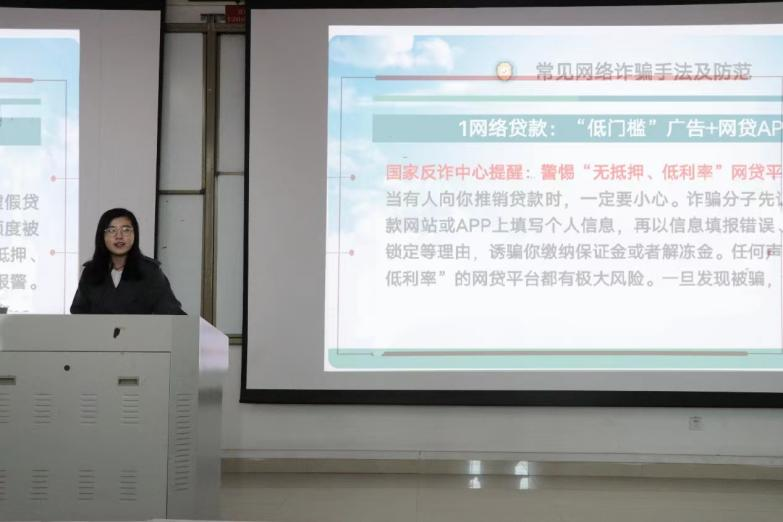 会议伊始,侯琳首先就网络贷款、兼职刷单、杀猪盘、冒充“公检法”及私下交易等几类常见的电信诈骗手段进行了详细的讲解。随后通过身边典型案例分享及反诈视频宣传等途径,向同学们介绍网络诈骗的惯用套路,让同学们进一步认识电信诈骗的危害。最后,再次提醒各位同学,在平时的学习和生活中多关注自己的财产安全,树立正确的消费观,自觉抵制各种诱惑和不法侵害。遇到疑似电信诈骗时要做到“不轻信、不点击、不透露、不转账”,如有疑问应及时联系辅导员或拨打110报警求助。