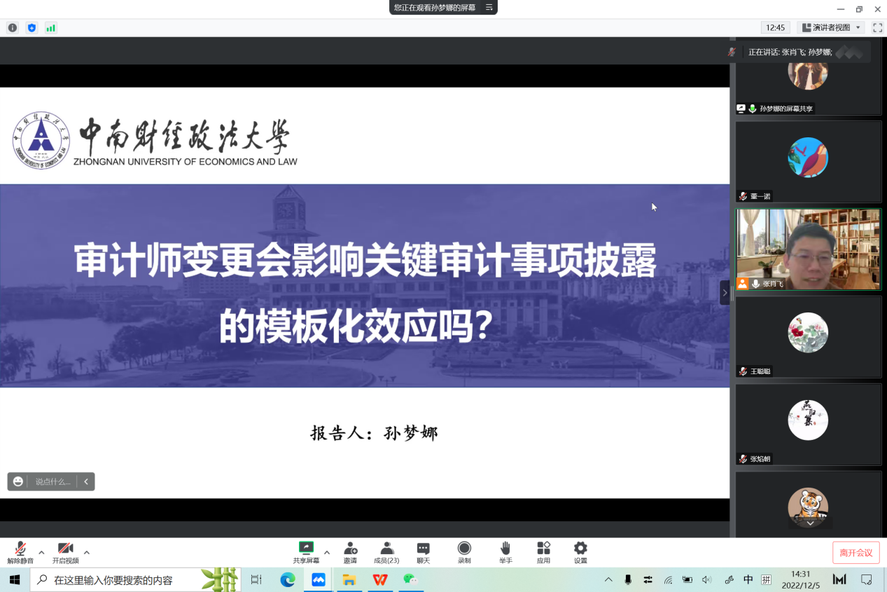 12月5日下午两点半,亚博取款曝顾秒到账第9期学术讲座于腾讯会议线上召开。本次讲座由中南财经政法大学博士研究生孙梦娜主讲,以“审计师变更会影响关键审计事项披露的模板化效应吗?”为题进行了汇报。亚博取款曝顾秒到账部分老师和研究生参加了此次学术讲座,本次讲座由副院长张肖飞主持。
